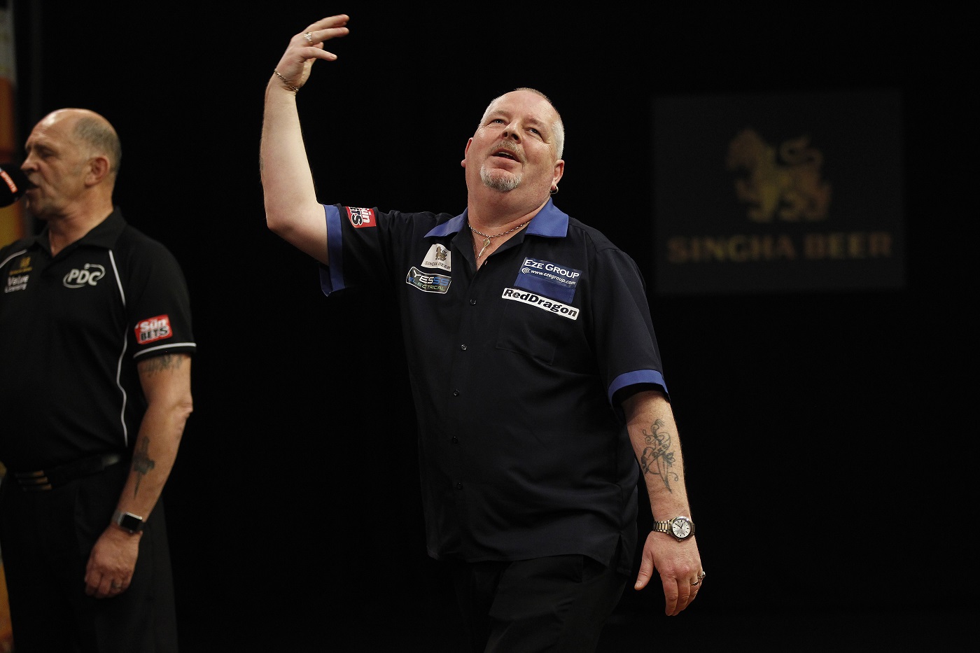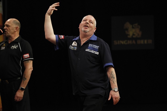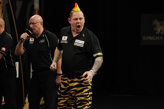 MICHAEL VAN GERWEN stepped up his bid to retain the SINGHA Beer Grand Slam of Darts title as he powered into the quarter-finals by defeating Robert Thornton on Wednesday, as Peter Wright, Phil Taylor and Brendan Dolan also enjoyed second round wins.