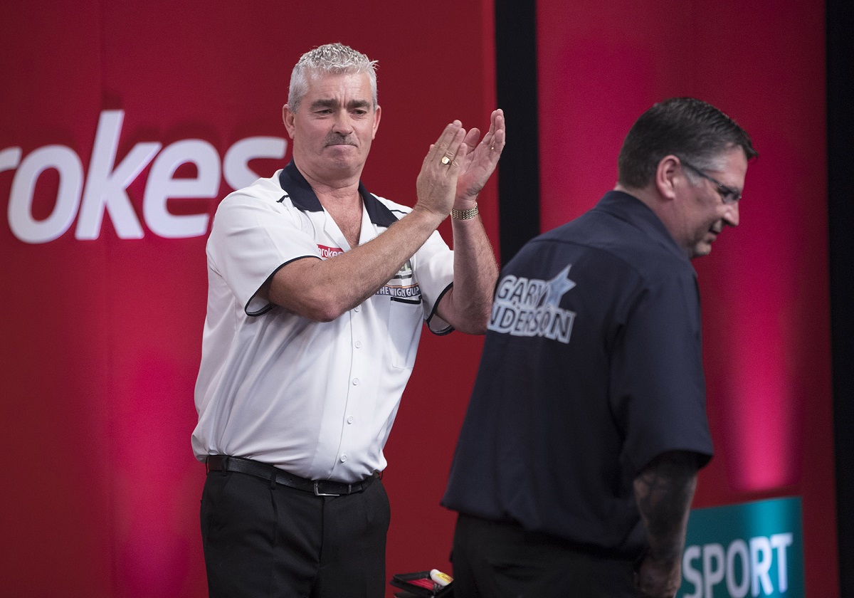 Day One of the unique event saw Mervyn King claim a 10-6 victory over two-time winner Van Gerwen, while reigning champion Anderson's return from injury ended in a 10-8 defeat at the hands of UK Open ever-present Steve Beaton.